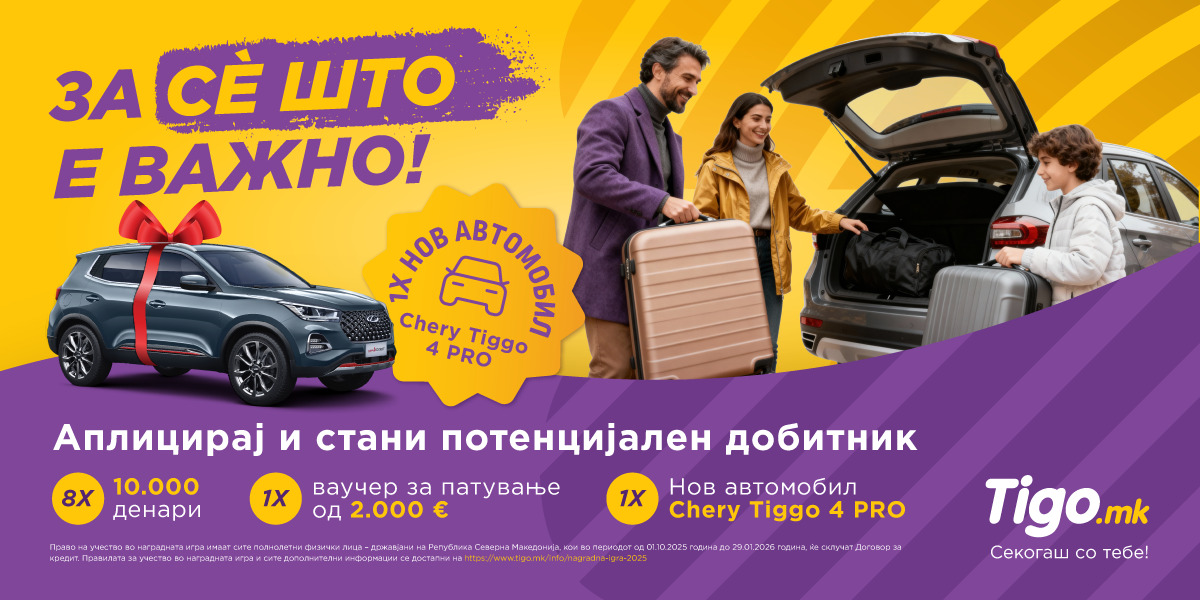 мкд | 10.10.2025 Tigo.mk ја започна својата најголема наградна игра досега: Нов Chery TIGGO 4 PRO, патување од соништата и парични награди