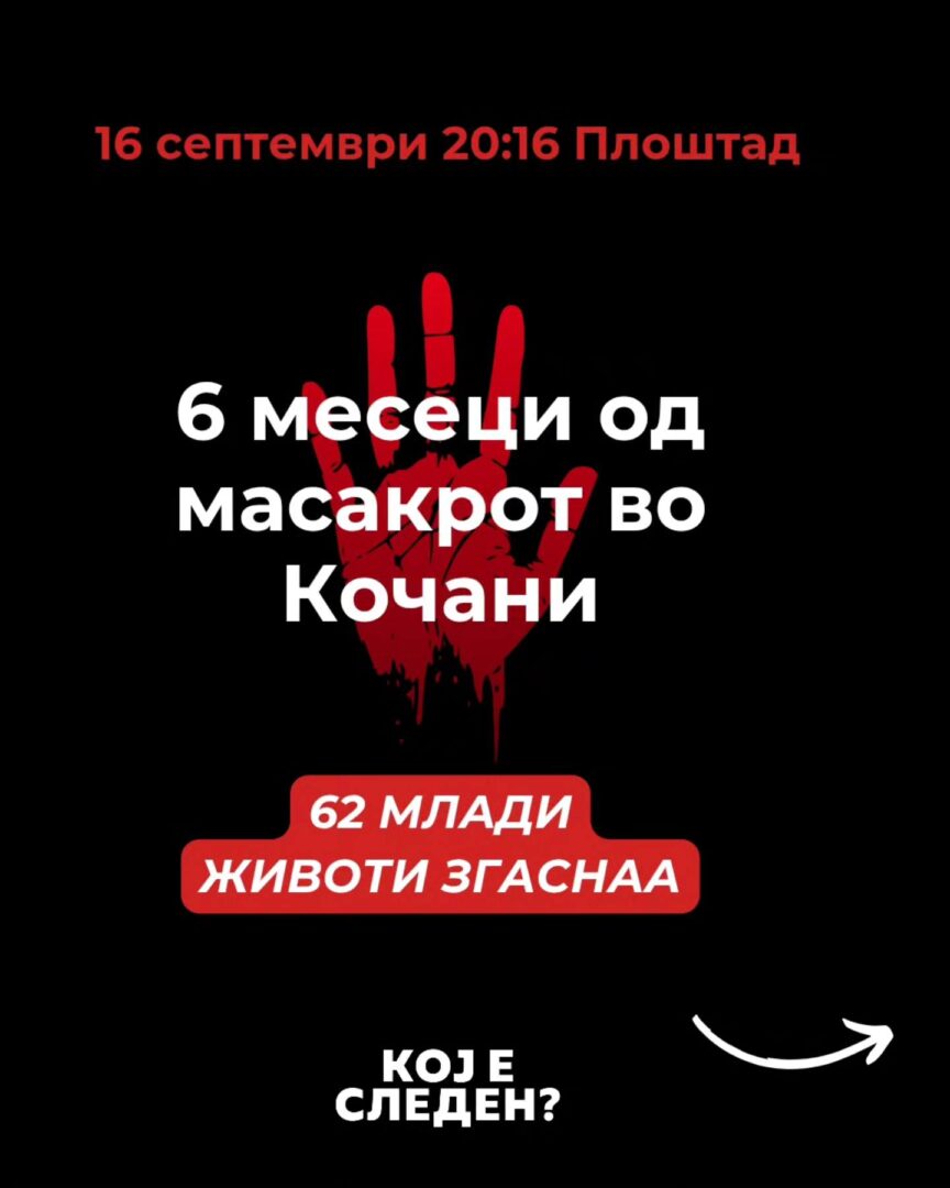 мкд | 15.09.2025 Утревечер собир на плоштадот „Македонија“ во Скопје: со ѕвездено небо и молк да обележиме шест месеци од масакрот во Кочани