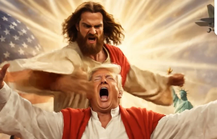 Иран ја искористи целата ситуација и направи своја верзија на сцената од сликата. Во видео направено со вештачка интелигенција, а објавено на мрежата X, Исус лета од небото и го удира Трамп.