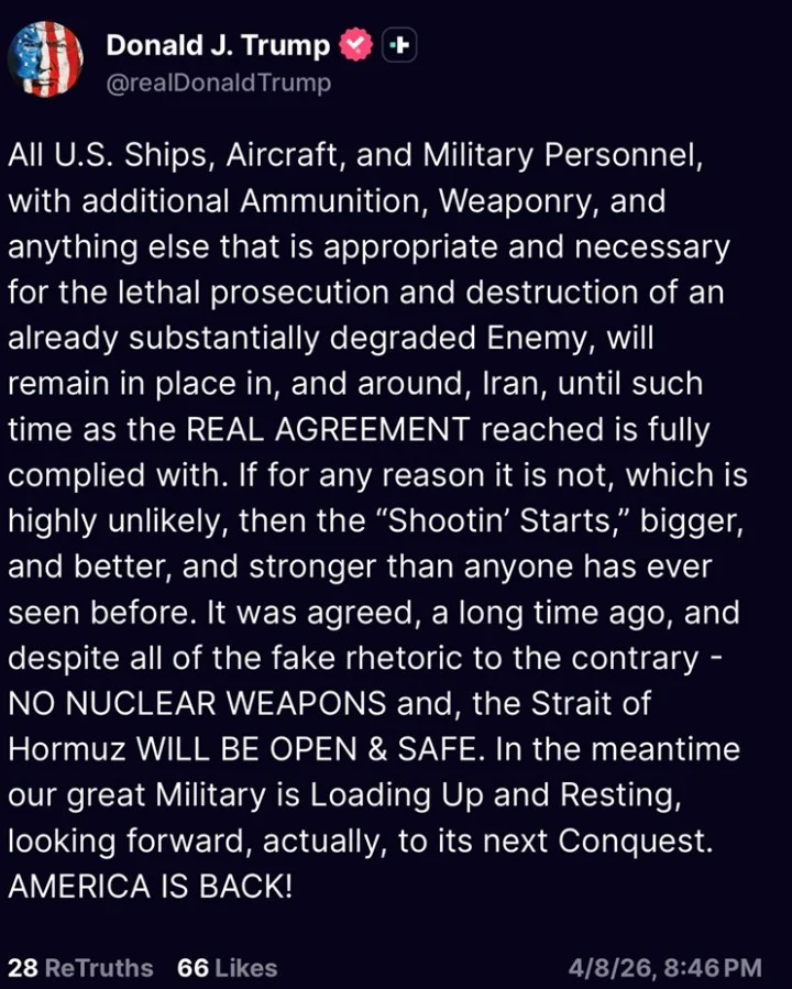 „Сите американски бродови, авиони и воен персонал, со дополнителна муниција, оружје и сè што е соодветно и потребно за спроведување смртоносни операции и уништување на веќе значително ослабен непријател, ќе останат распоредени во и околу Иран сè додека ПОСТИГНАТИОТ ДОГОВОР не биде целосно имплементиран.