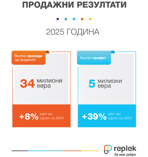 Со раст на профитабилноста, силни позиции на пазарите и континуиран раст на продажните резултати, „Реплек АД Скопје“ ја заврши 2025 година. Компанијата оствари видливо унапредување на профитабилноста генерирајќи профит од 5 милиони евра, односно раст за 39% во однос на 2024 година. Нето профитната маргина се зголеми од 11,5% на 15%, што ја потврдува способноста на компанијата да генерира одржлива вредност и повисока ефикасност во работењето, дури и во услови на интензивни инвестициски активности.